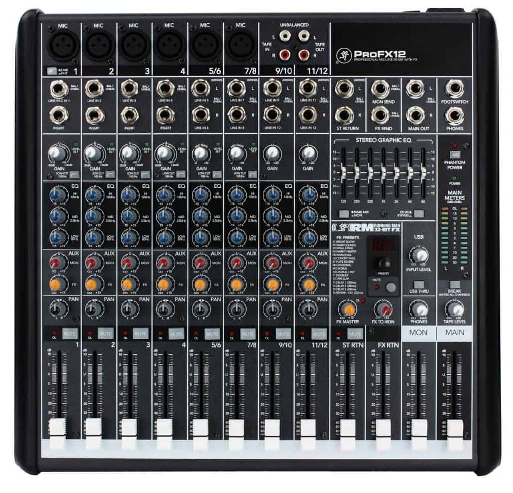 The Mackie ProFX12 is loaded with six Mackie high-headroom, low-noise mic preamps, 3-band EQ, a built-in DI for direct connection of a guitar or bass, integrated “Gig-Ready” effects, precision 7-band GEQ and more.