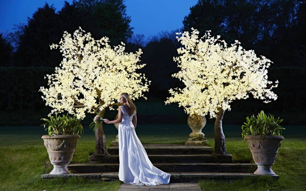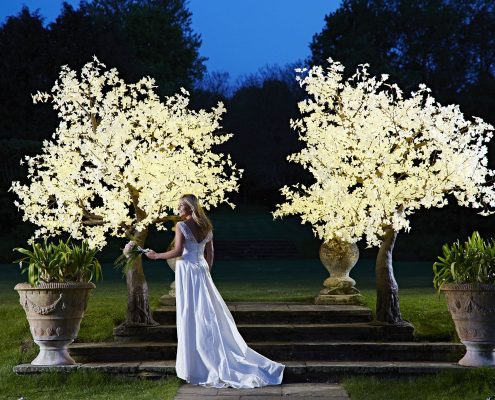 These stunning light-up blossom trees are a simple and unique way of adding beauty to any venue. They stand at 2.4m (8′ foot) high, with a wide spread of dark branches covered with hundreds of delicate white blossom flowers, each illuminated with a crisp white LED light. They frame an aisle or an entrance magically, automatically creating a focus point for the space.